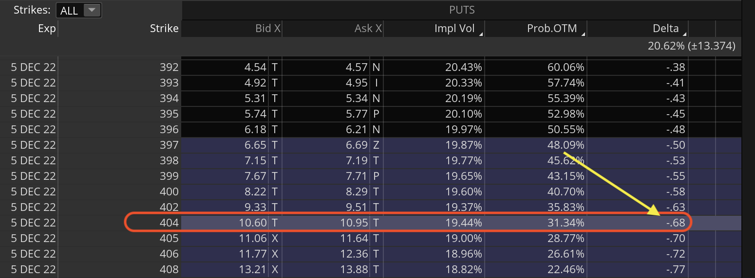 Using a put option example, notice the 404 strike price has a -.68 delta. Every $1.00 move in the underlying stock will move .68 depending on the direction of the underlying instrument.