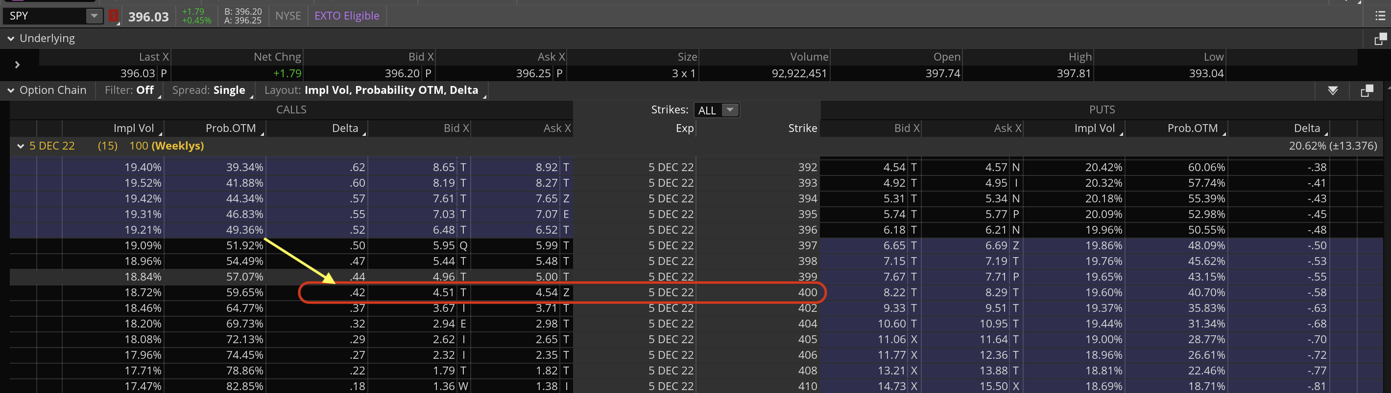 Imagine you bought an OTM call option on SPY with the strike price of $400 and the delta was 0.42 as seen on this options chain. Now, every $1 move up in price will be an additional 0.42 price increase with the option. Call options will have a delta between 0 and 1 while put options will have a delta between 0 and -1. The delta of a call option increases in value as a stock moves up and decreases as the stock moves down. The delta of a put option decreases in value as a stock moves up and increases as the stock moves down.